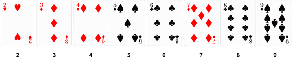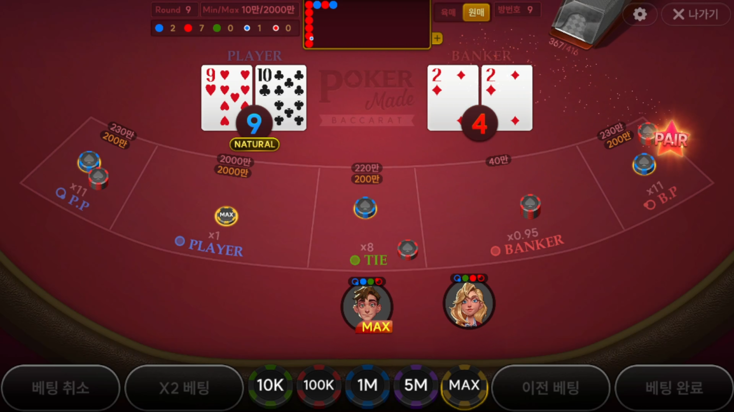 | 8, 9 | 내추럴 (Natural) 플레이어와 뱅커 모두 카드를 더이상 받지 않습니다. |