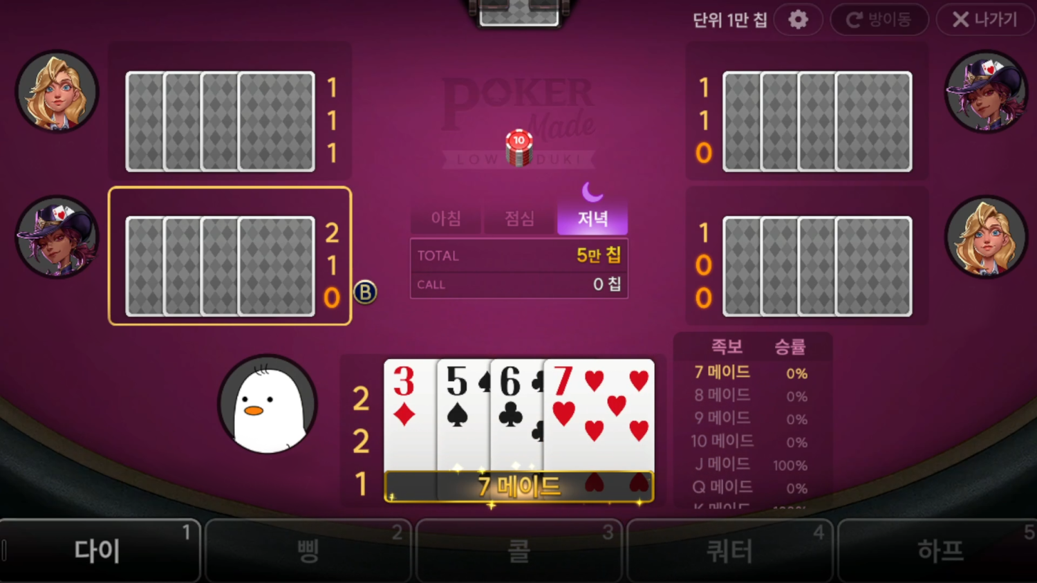 저녁의 카드 교환 이후 각 플레이어들의 완성한 족보로 승패를 결정합니다.