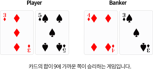 플레이어(Player)와 뱅커(Banker)는 2장의 카드를 받게 되며 (조건에 따라 세 번째 카드가 배분 됨) 카드의 숫자를 합산하여 9에 가까운 쪽이 승리합니다.