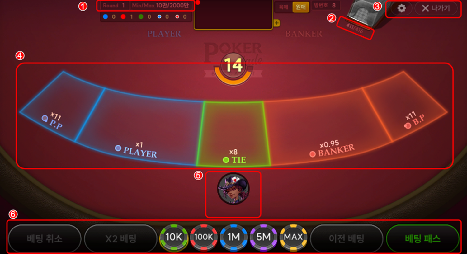 베팅 구역 당 최소 ~ 최대 베팅 가능 금액 안내 방 번호를 확인할 수 있습니다.