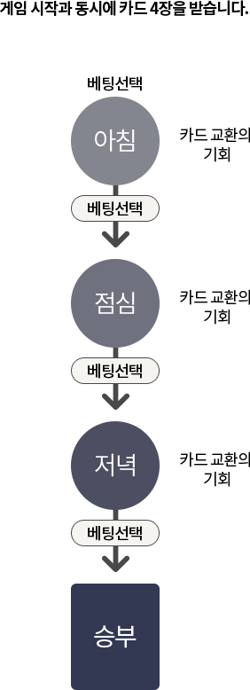 아침, 점심, 저녁에 카드 교환의 기회를 가지며 베팅을 진행합니다.