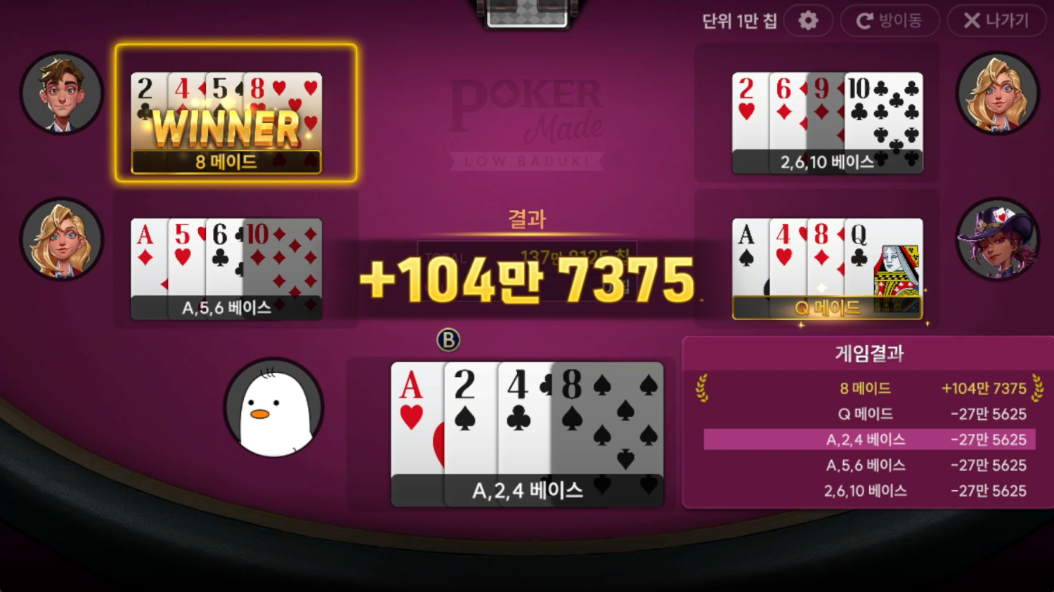 저녁의 카드 교환 이후 각 플레이어들의 완성한 족보로 승패를 결정합니다.